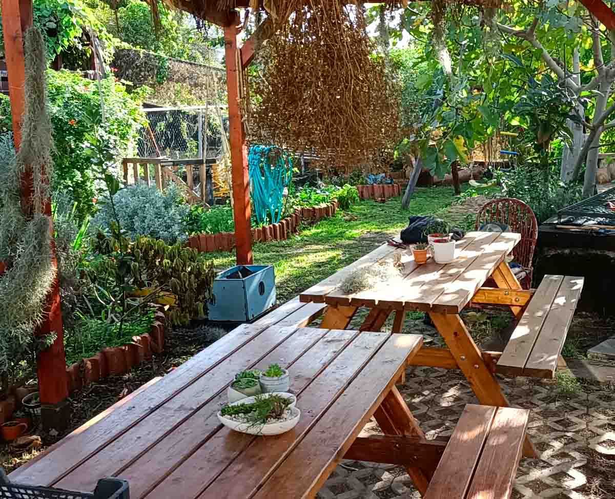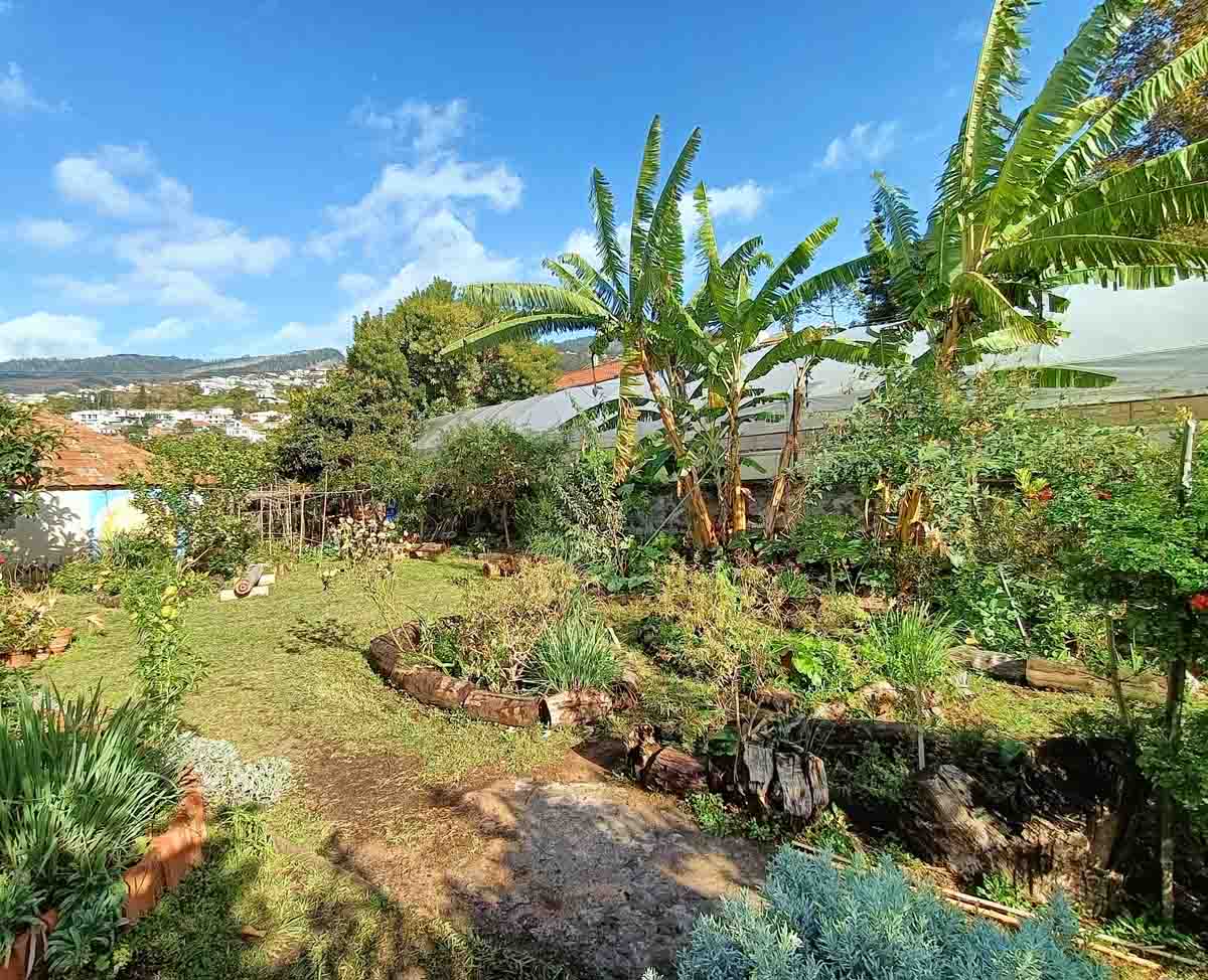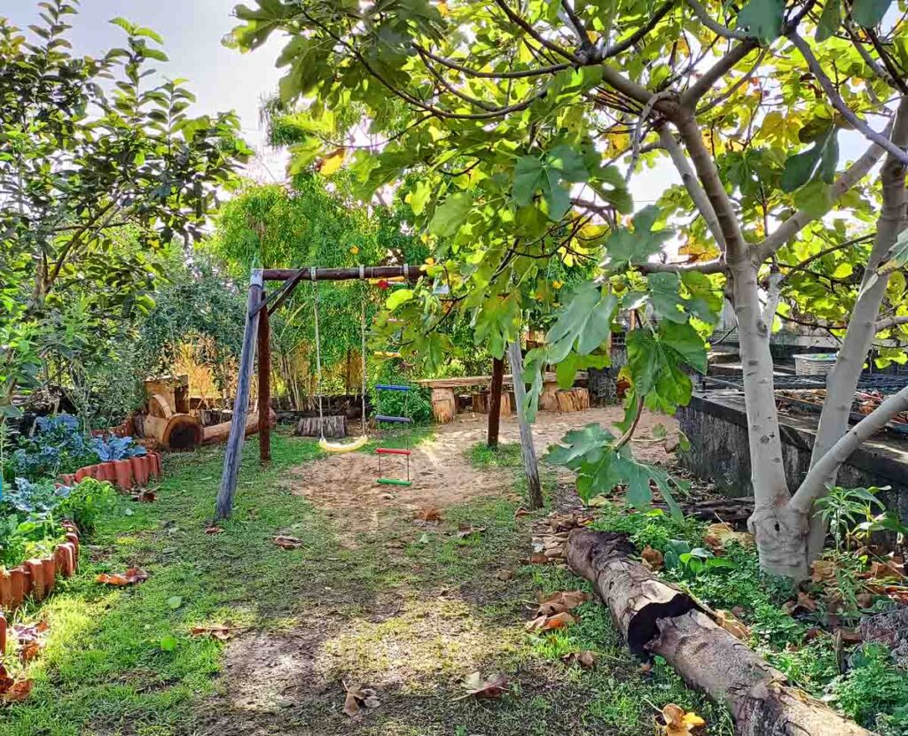 Projeto integrado num jardim de infância, com horta e jardim comestível. Os canteiros foram feitos com recurso a troncos, telhas e madeira. Na fase inicial, as zonas de circulação foram cobertas com estilha. Com a evolução do sistema desenvolveu-se um coberto vegetal permanente.