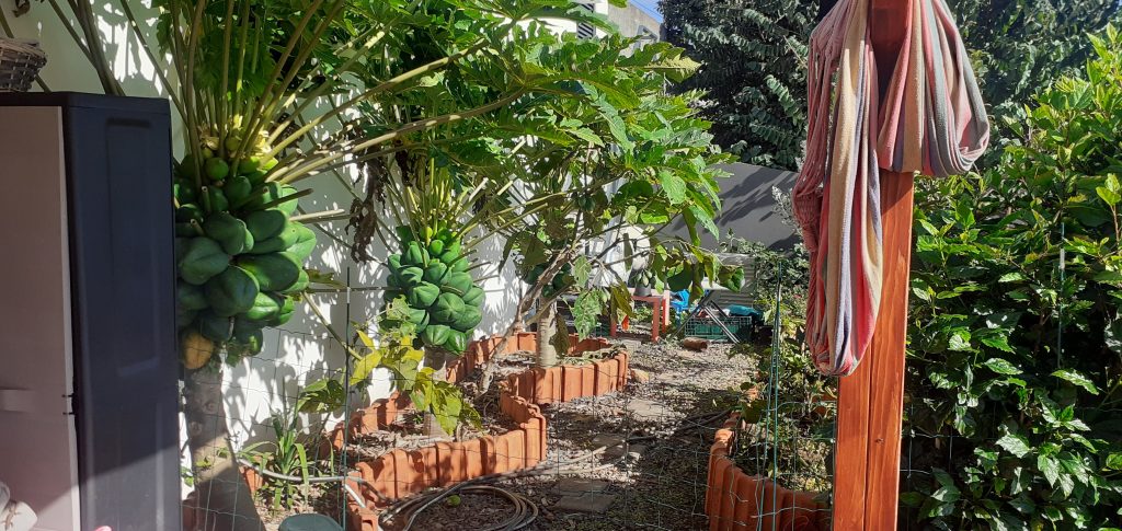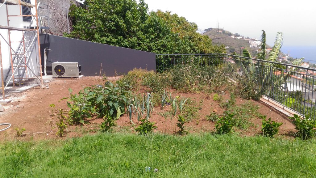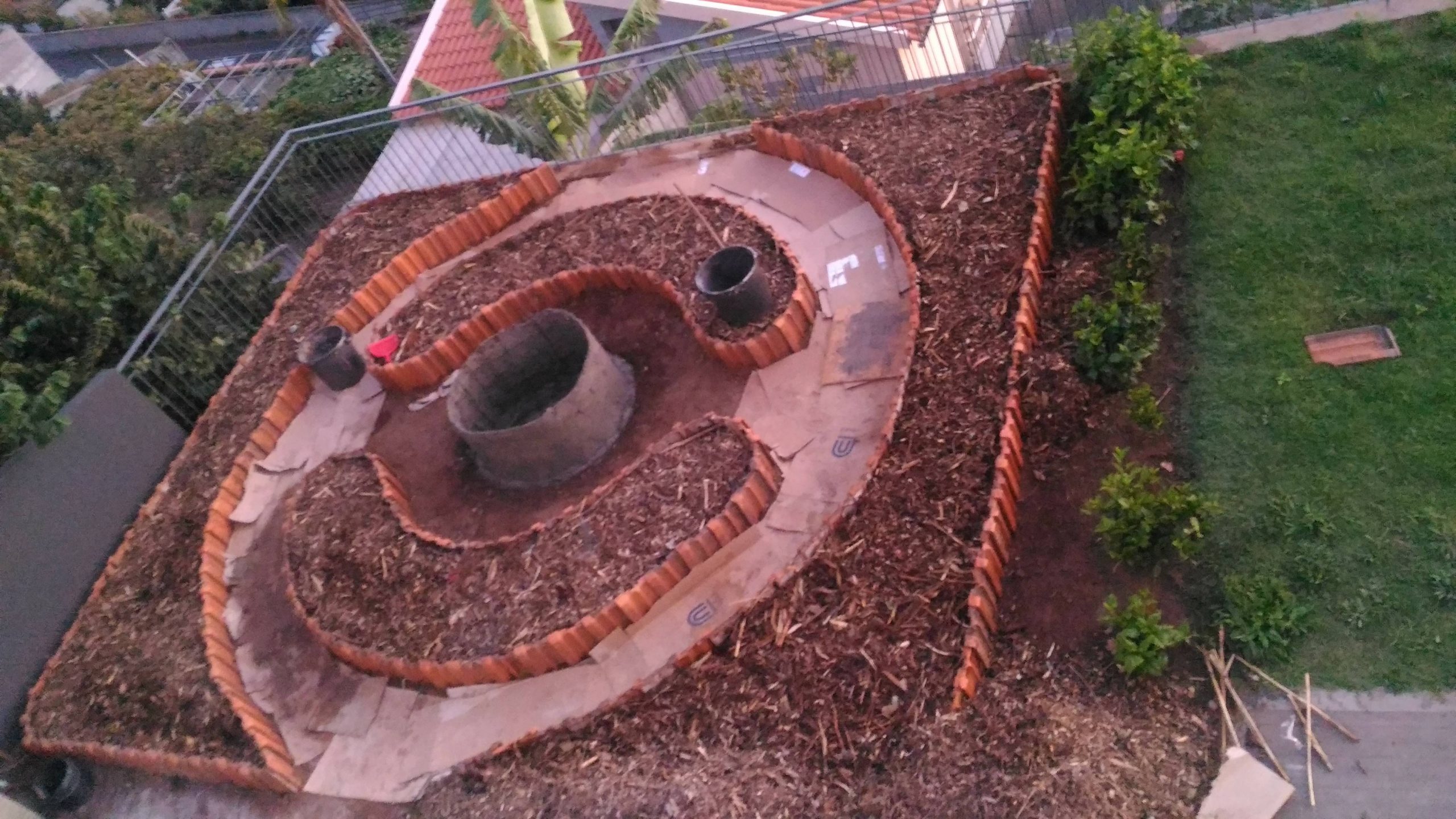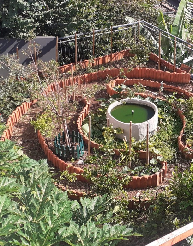 Jardim de uma casa particular em forma de mandala, com lago no centro. A delimitação dos canteiro foi feita com telha. Neste sistema foram plantadas várias arvores de fruto, papaieiras, aromáticas e hortícolas. O solo foi adicionado composto, pó de pedra e calcário e coberto com estilha. A Oeste tem uma sebe de Hibisco, que serve de separação da zona de relva e também de proteção dos ventos.