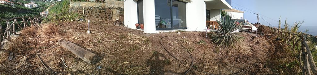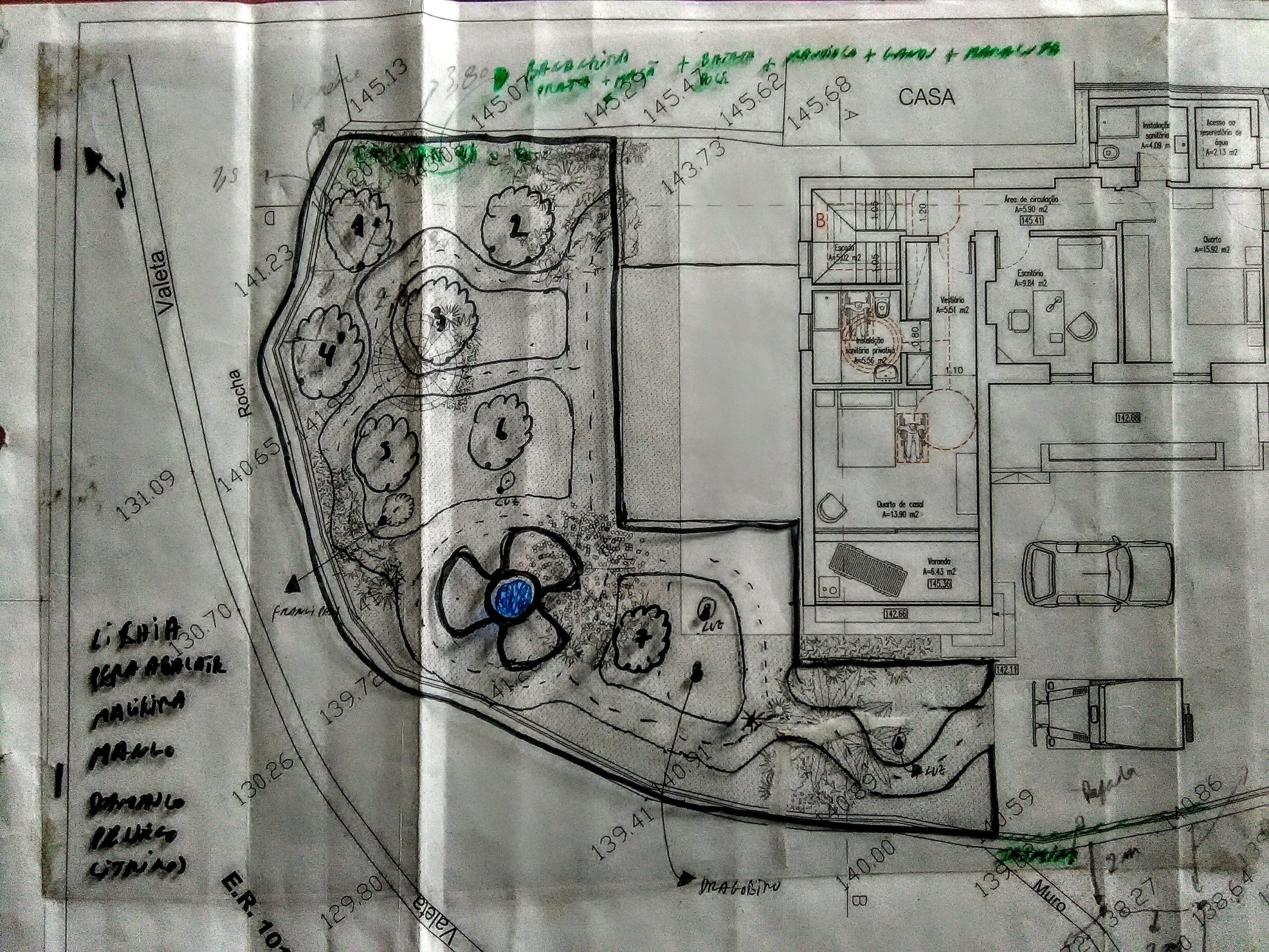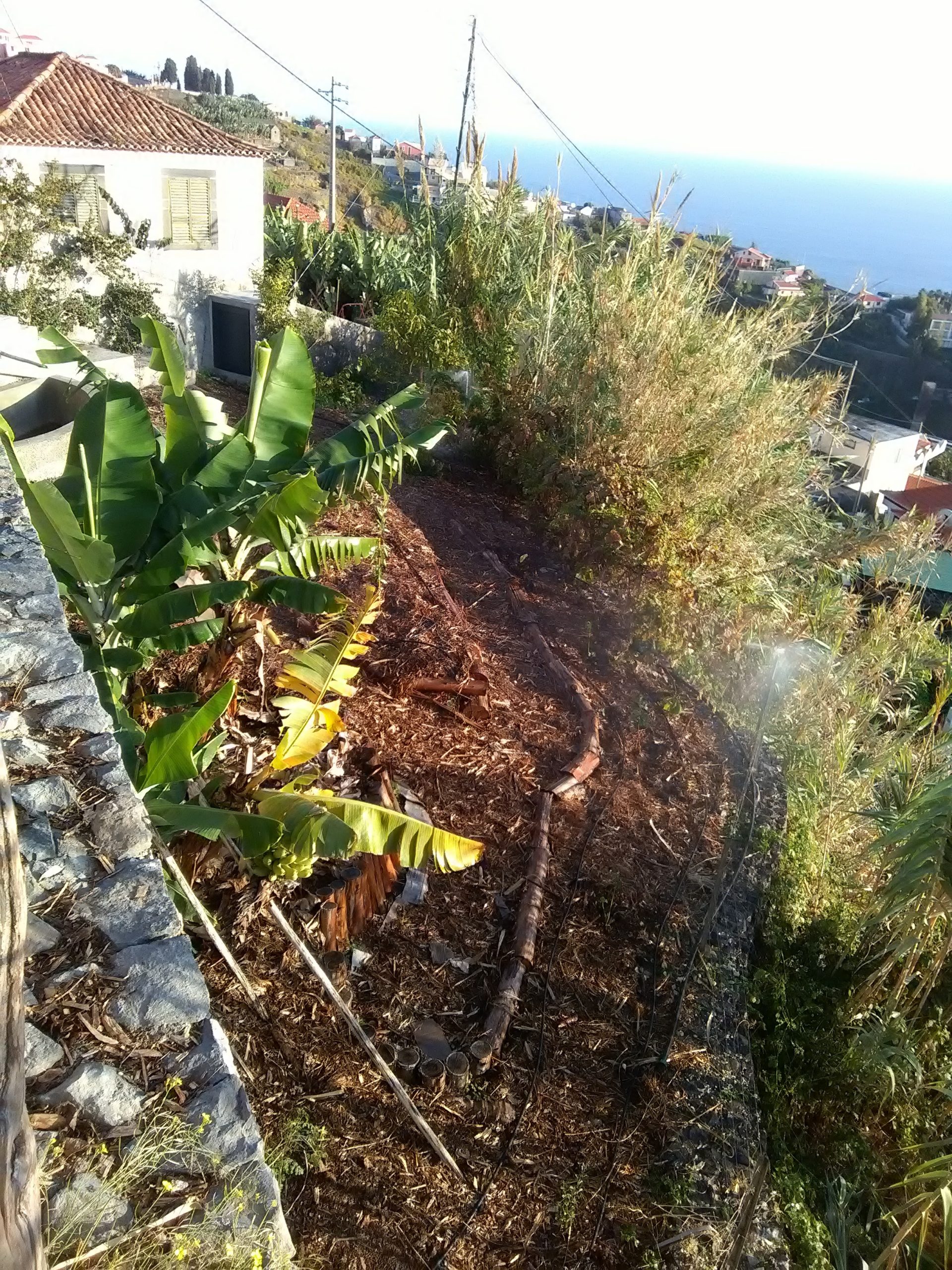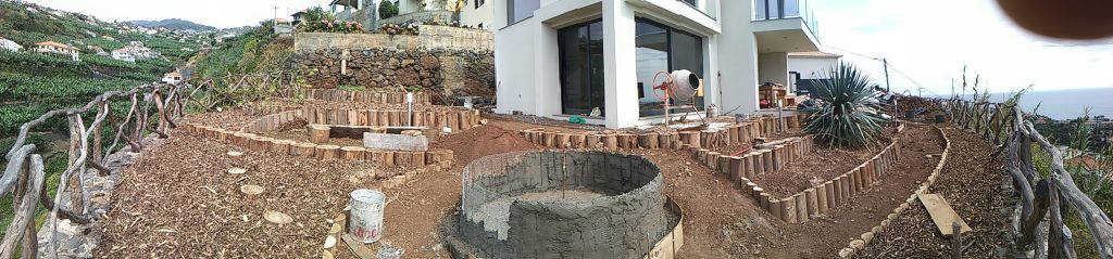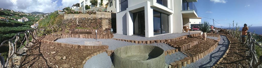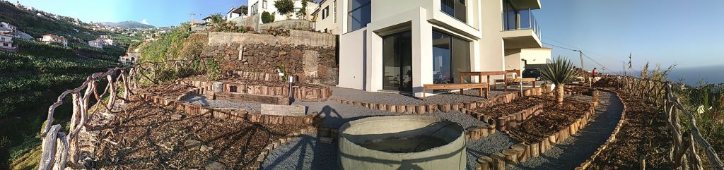 Jardim comestível em casa particular. Canteiros delimitados com troncos de eucalipto e caminhos cobertos com gravilha. Foram plantadas várias árvores de fruto, bananeiras, aromáticas e flores no sistemas. Para proteção do vento foi plantada uma pequena sebe de vetiver. O solo foi melhorado com composto, microrganismos eficientes e pó de pedra. Os canteiro forma cobertos com estilha.
